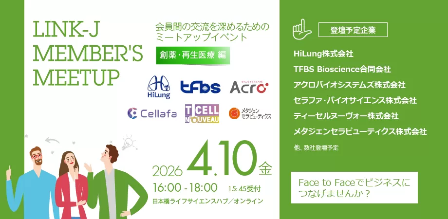 2026年4月10日(金)に日本橋ライフサイエンスハブおよびオンラインで開催される「第26回LINK-J Member's Meetup 創薬・再生医療」に、弊社TFBS Bioscienceが登壇します。